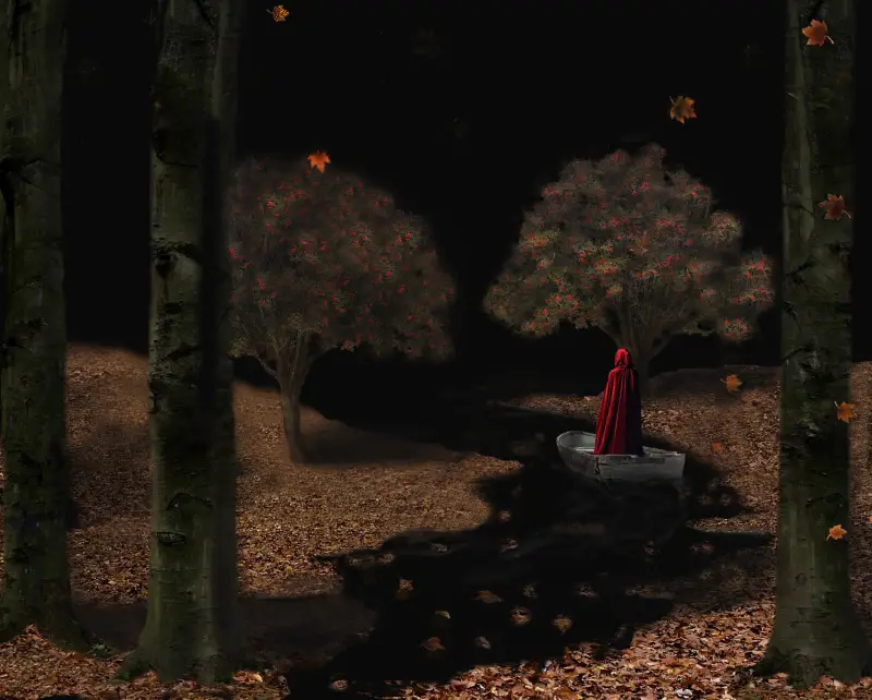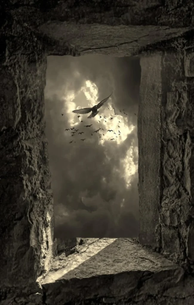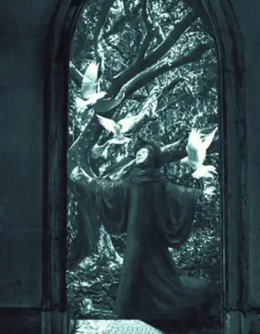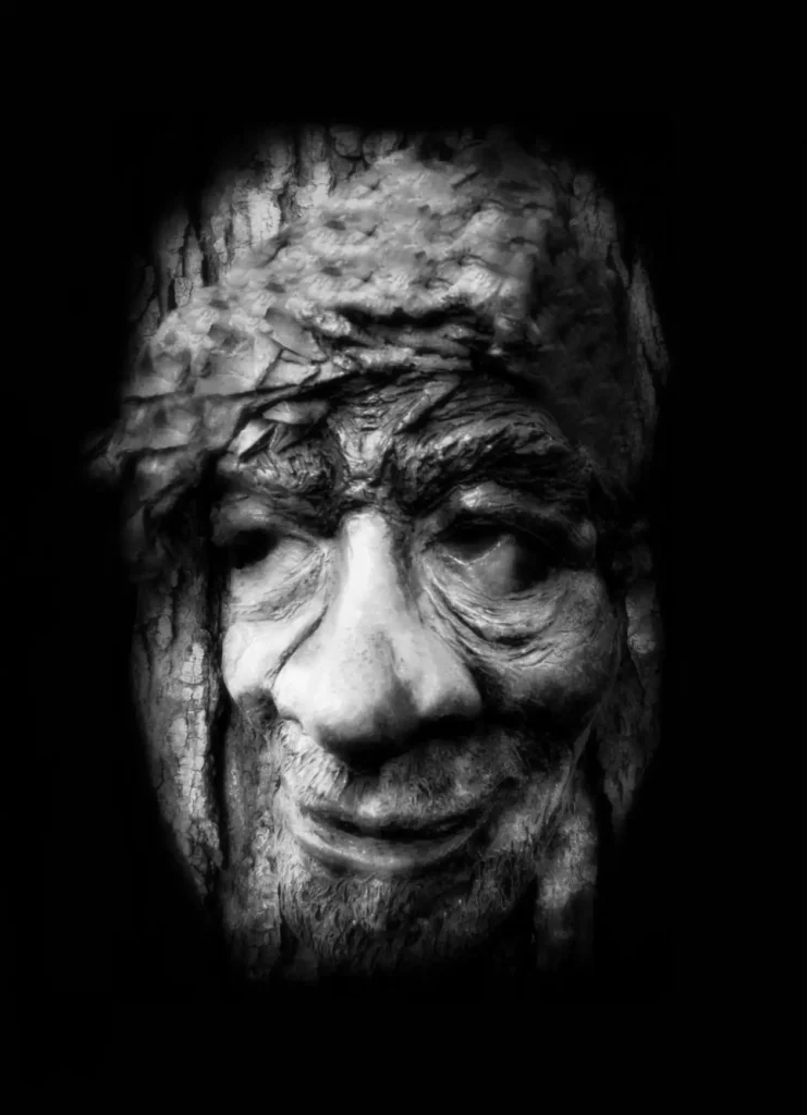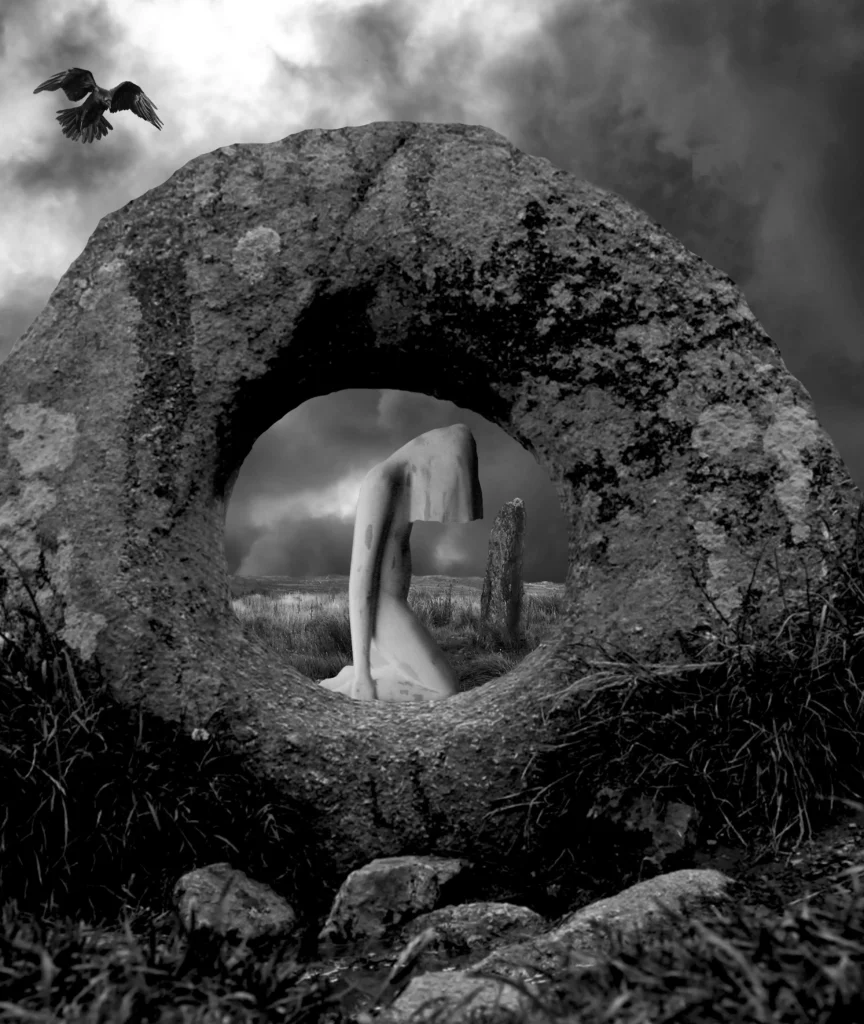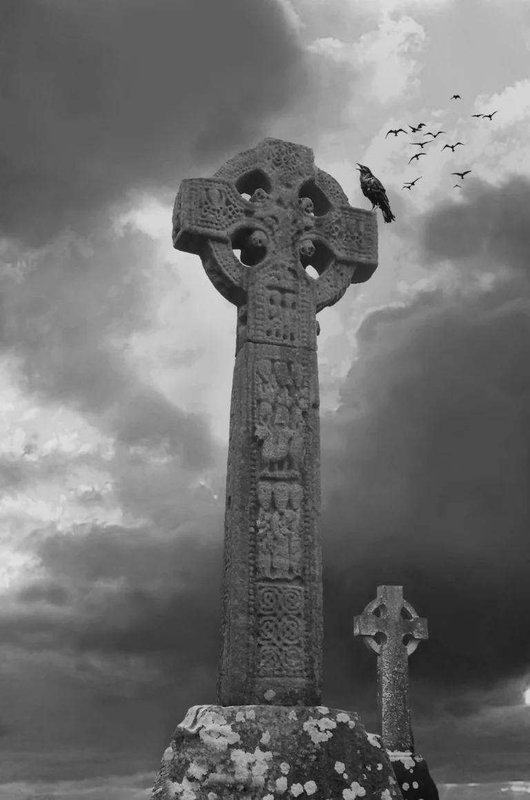 A sculpted wooden figure is set in my created image. Dating over 5000 years, the Great Goddess Morrigan was the dominant deity throughout Europe. She is the transporter of souls between life and death. She is found where armies gather, where wars rage, and where wisdom and warnings are needed. Only by appealing to her can a warrior become king or an army succeed. On the battlefield, she appears as a crow who can influence the battle’s outcome. The Celts believed as they engaged in the battle, the Morrigan flew shrieking in crow form, summoning a host of slain warriors to a macabre spectral bane. When the battle had ended, the warriors would leave the field until dawn the following day—allowing Morrigan to claim her trophies. Paul Nixon, Irish folklore.