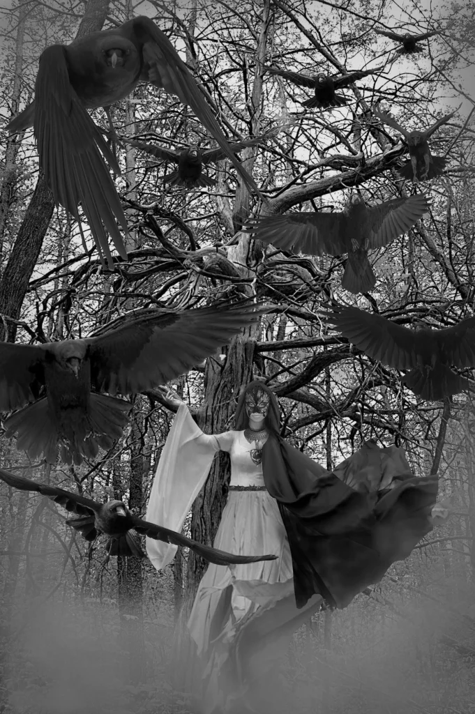 In Celtic mythology, the Morrigan was associated with war, battlefields, death, and sovereignty; she could shape-shift into a crow or raven. Dating back to the Copper Age, she was the dominant Dark Death Goddess of Ireland, Wales and Britain. She is one of the original members of the Tuatha De Danaan (People of the Goddess Danu), an intimidating and fierce Goddess of sovereignty. The Morrigan exists between the worlds of life and death and the Celts believed she could revive their dead soldiers to fight once more. The severed heads on the battlefield were called the “Mast of Macha” (harvest of Macha). The ground was considered sacred after the battle, as the soldiers would leave until the next day so Morrigan could gather the souls undisturbed.
