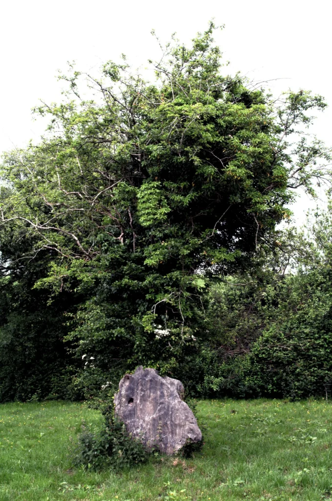 In 2018, while returning home to Dublin from the West of Ireland. My family and I stopped for a picnic lunch in West Meath at an abandoned farmhouse in a rural setting. My brother Peter had been there before and suggested this a peaceful place to stop. Exploring this area, in a field next to the house, I came across this old Hawthorn tree. With an enormous-sized boulder leaning against its trunk. The Hawthorn is considered a very sacred tree to the fairies and is considered to boast the most sinister reputation in Celtic tree lore. Because of these trees and flowers in the spring, it was associated with the festival of Bealtaine, a sacred time In Irish mythology. The beginning of summer started with the Fire Festival at Beltane. Great bonfires would mark a time of purification and transition. It signaled the season in the hope of a good harvest later in the year. They were accompanied by rituals to protect the people from harm by otherworldly spirits. Serious ramifications were known to occur when one of these trees was cut down to clear the land. Farmers who have caused such destruction, well, their lives would suffer great misfortune for the rest of their days. Those that heeded the fairy warnings would protect their trees by placing rocks and boulders around their base to protect the trunk from damage when the farmer plowed his land. This belief was taken so seriously that in 1999 the upgrading of the National route from Limerick to Galway was delayed. Rerouted and ultimately opened nearly ten years after it was supposed to have started. The Clare County Council, as part of their Contract, had to protect the fairy tree access, which was not permitted within a minimum of a 5m radius. A protective fence has been erected around it. The Hawthorn was often seen as a gateway into the fairy realms.