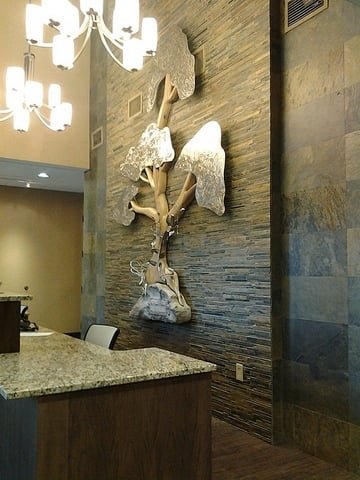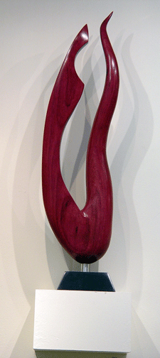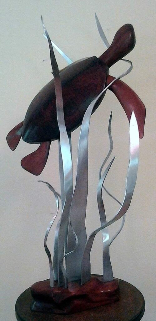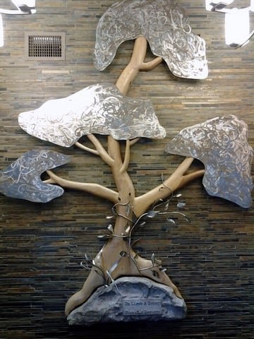 I sculpted this 13-foot-tall tree using poplar wood for the trunk, stainless steel to simulate the leaves, and aluminum with steel for the vine. The rock is created from a wooden shell covered with wire netting and then applying cement, which I formed to simulate a large rock.