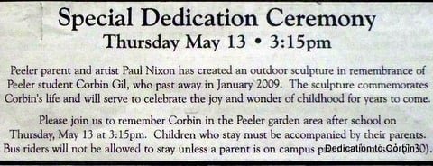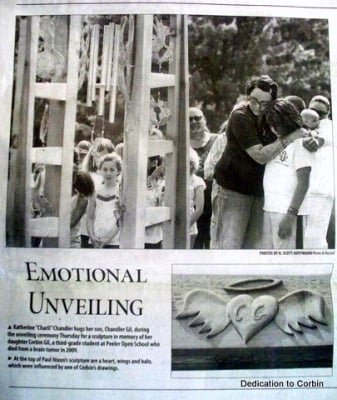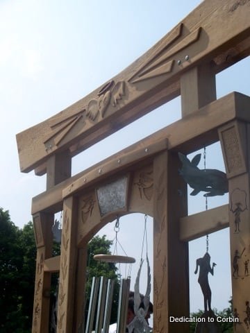 This young classmate to my daughter died at eight years of age after developing a brain tumor. I was deeply saddened by the loss of someone so young that I offered my services to the school to create a memorial that would be a fitting tribute to this brave and very popular child, as well as help the children deal with the concept of death. One night, awakened from a deep sleep, I remember laying there wondering what it was that had awakened me. I had become so wide awake that I wanted to get up, however, given that it was about 2 AM, I knew that the next day I would end up paying for it. I decided to try to go back to sleep. After some time while trying to relax to where eventually I was almost asleep, this marvelous image suddenly appeared in my mind. It had such clarity that I blurted out, then looked to see if I had awakened my wife. I saw a silhouette of Corbin sitting in a swing and looking back over her shoulder from where she had passed through. On each side of her were two angels waiting to welcome her. Images of her life and silhouettes of her favorite animals were revolving in their separate windows on each side of the doorway. Overhead in a great arch was a reminder of where we all came from as we pass downward into this life before we return again to the heavens. Immediately after experiencing this, I got out of bed and sketched out the image that I saw. I was very excited in knowing that I had experienced something very special that would have a great impact on all those involved.